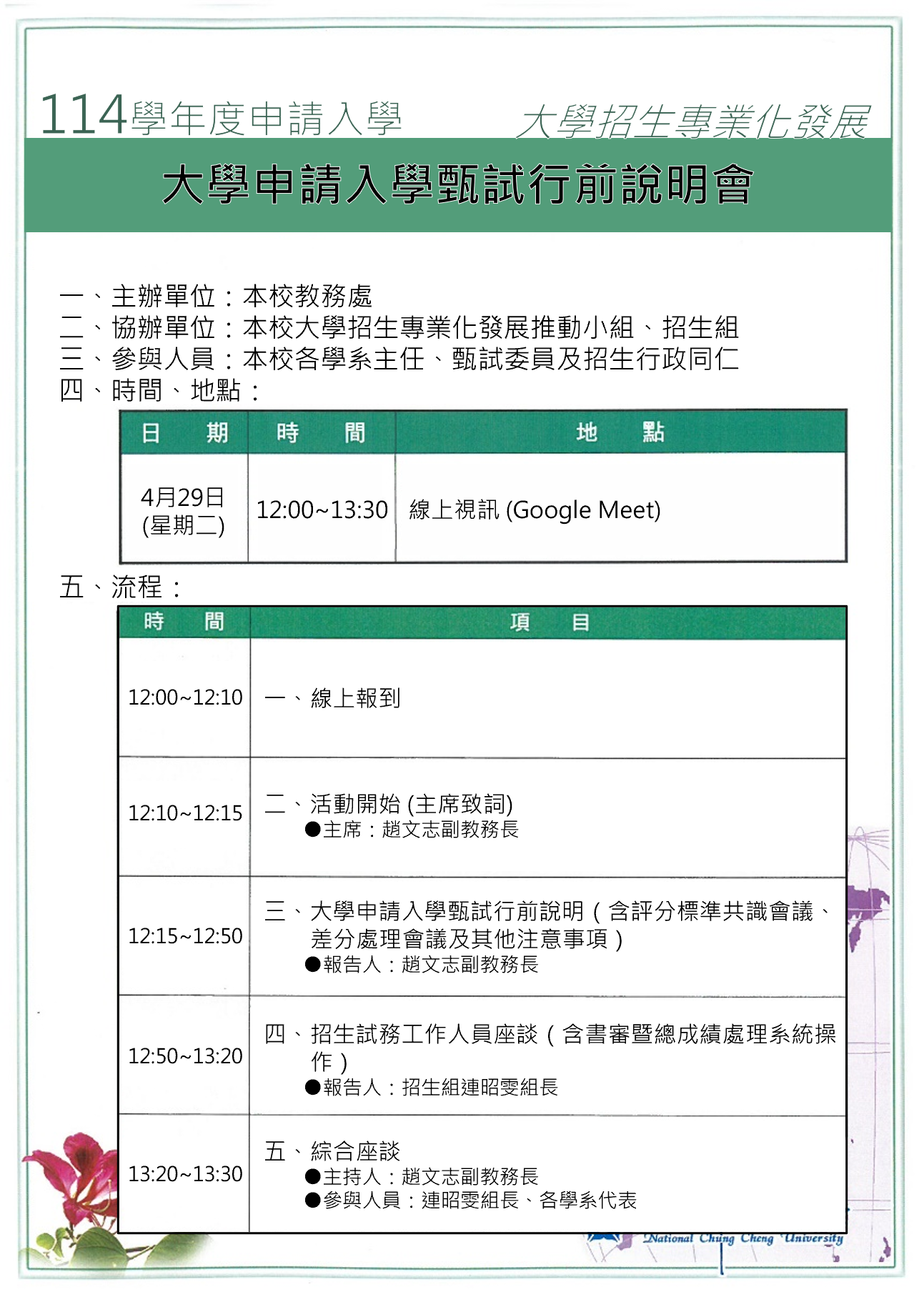 12:15 ~ 12:50 | 大學申請入學甄試行前說明 (含評分標準共識會議、差分處理會議及其他注意事項) 🍃報告人:趙文志副教務長 |