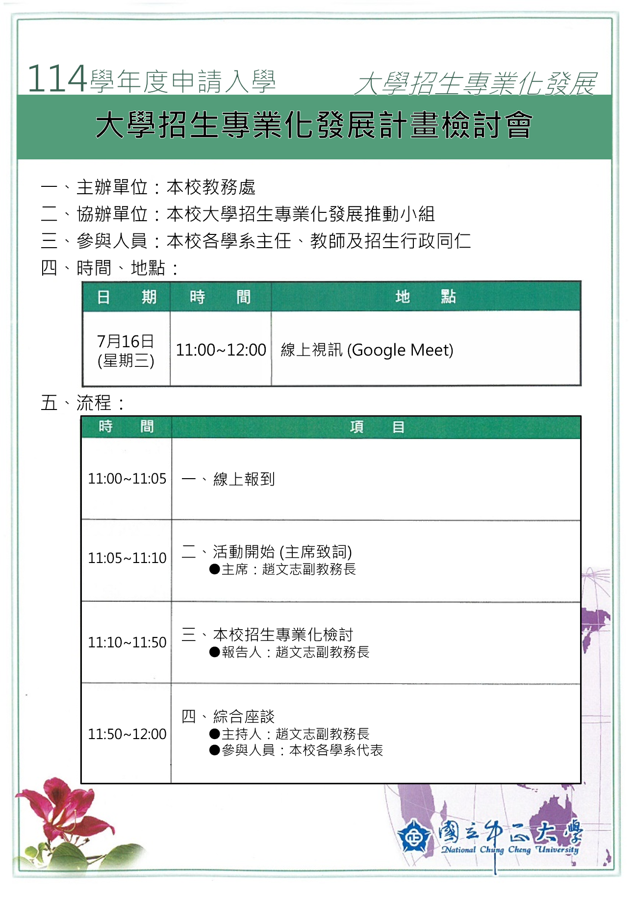 11:10 ~ 11:50 | 本校招生專業化檢討 🍃報告人:趙文志副教務長 |
