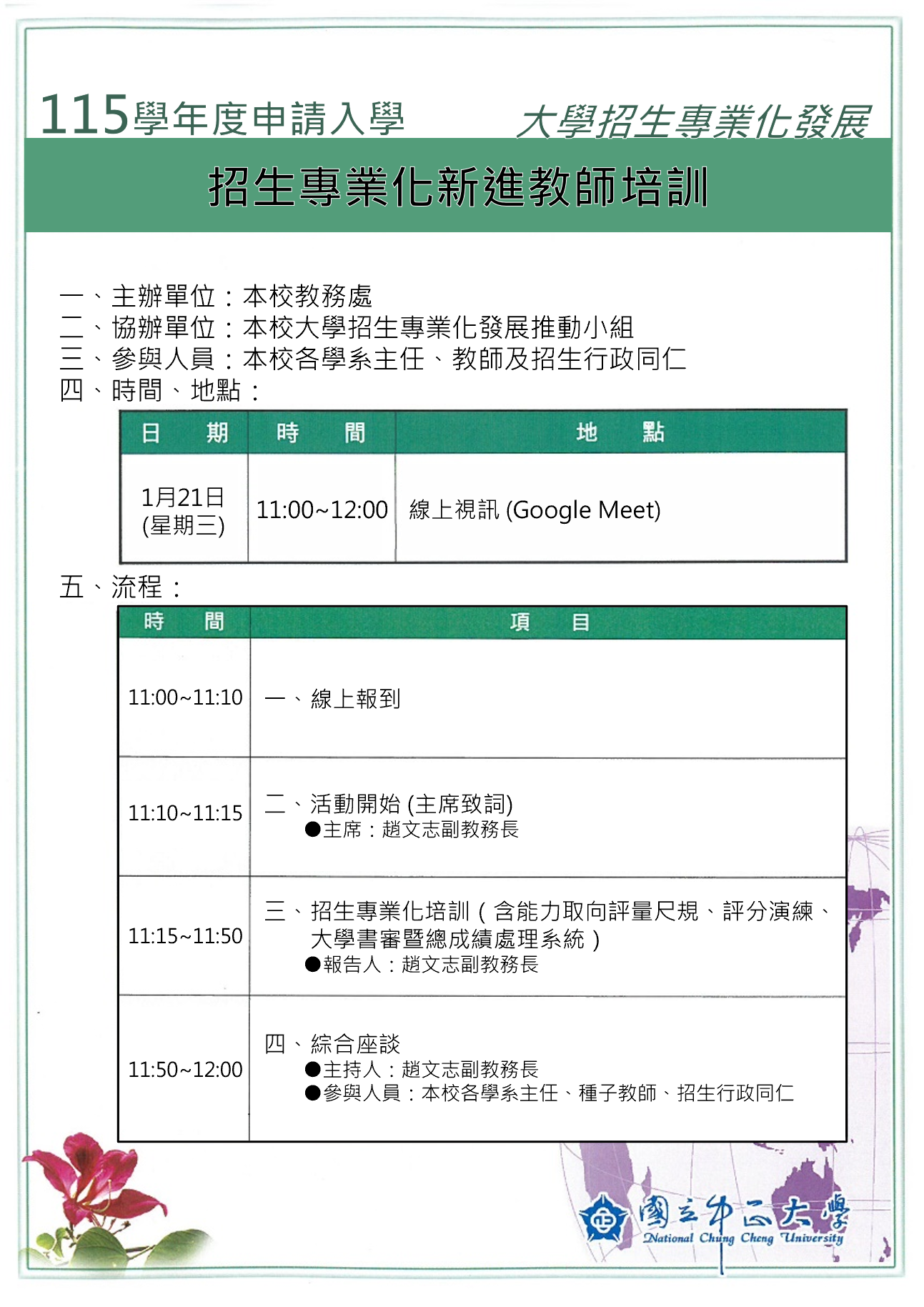| 11:15 ~ 11:50 | 招生專業化培訓 (含能力取向評量尺規、評分演練、大學書審暨總成績處理系統) 🍃報告人:趙文志副教務長 |